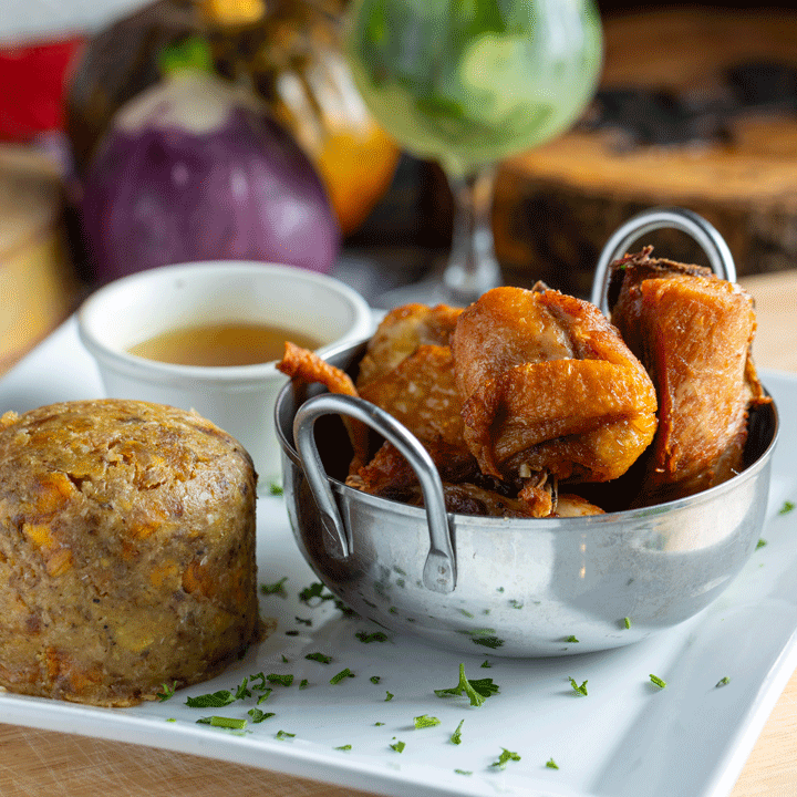 Mofongo is a Puertorican delicacy made with fried green plantain, garlic, and pork cracklings, smashed together in awooden mortar creating a soft consistency.